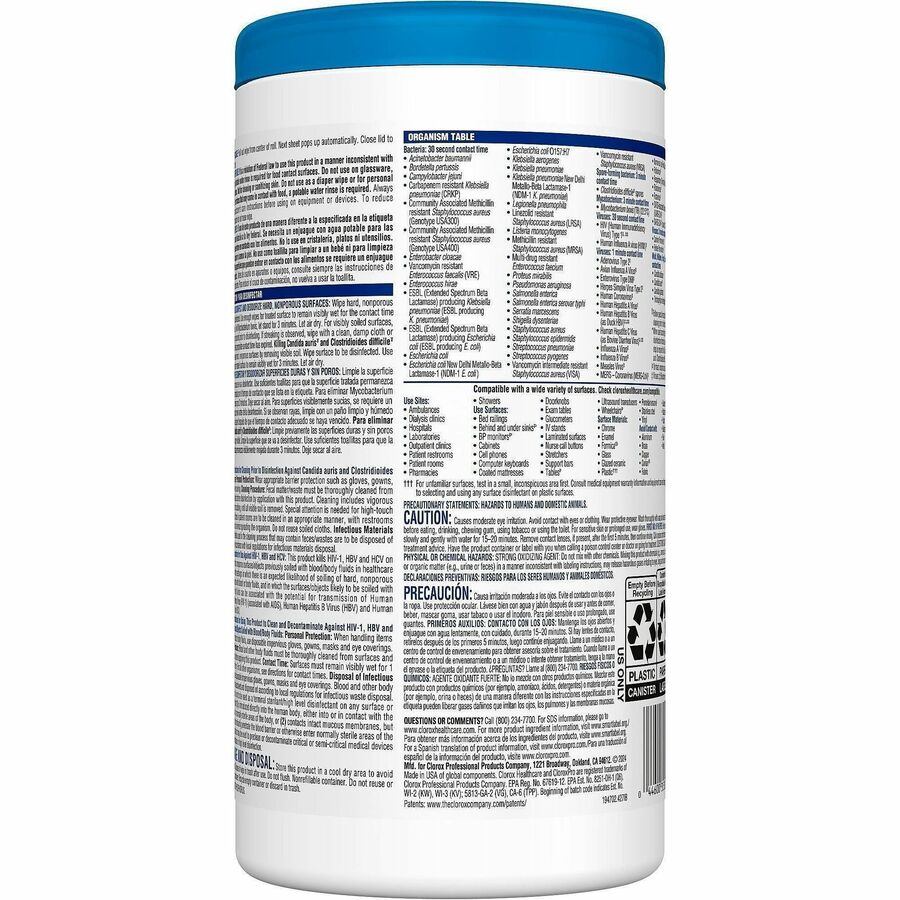 | Marketing Information | Clorox Healthcare Bleach Germicidal Wipes are your proven bleach solution for cleaning. They kill C. difficile and C. auris in 3 minutes (follow special instructions for cleaning before disinfection) and 58 other microorganisms in 1 minute or less, including outbreak-causing viruses, emerging viral pathogens, MRSA and VRE when used as directed. With superior surface compatibility on a wide range of hospital surfaces, these disinfecting wipes help you cover more square coverage per wipe with fast contact times and greater wetness surface coverage. Phosphate-free formula is gentle on surfaces and leaves less residue behind. Use wipes in healthcare settings including hospitals, medical facilities, outpatient facilities and long-term care facilities. Packaging may vary. |