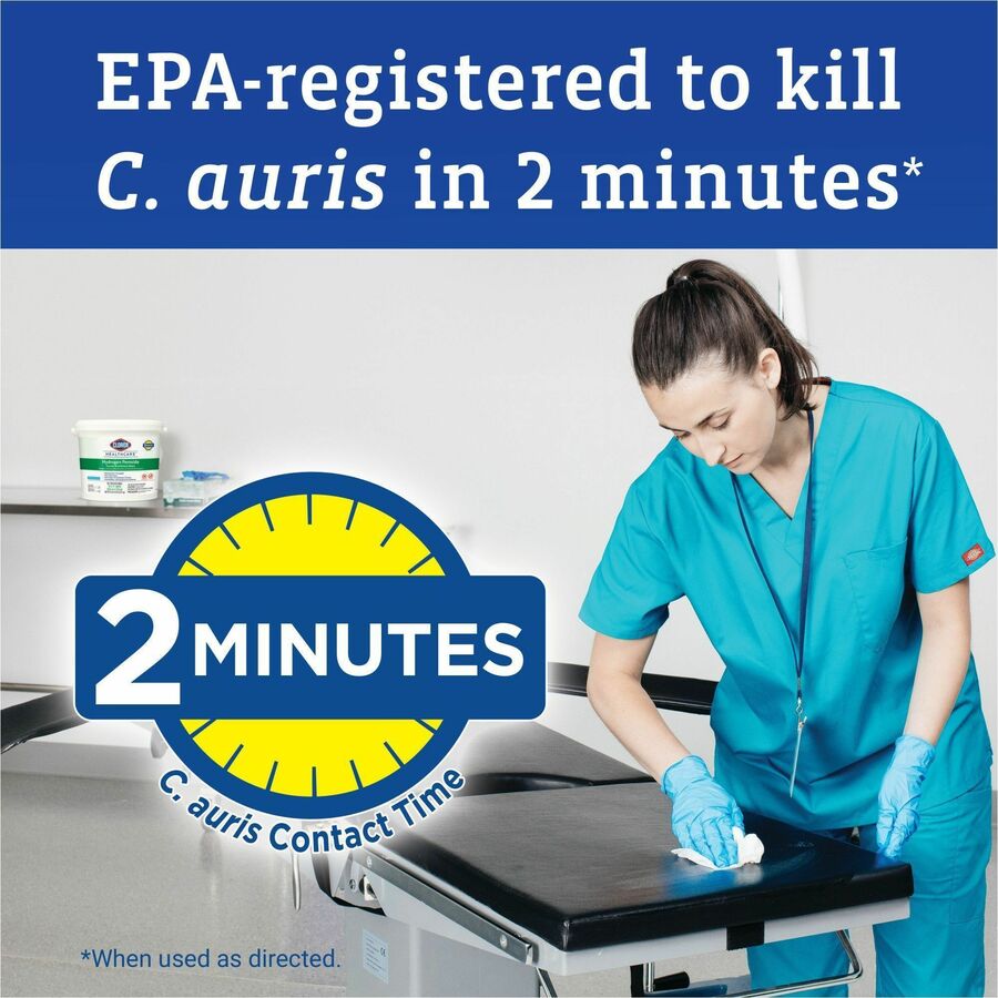 | Marketing Information | For great surface compatibility and less residue, Clorox Healthcare Hydrogen Peroxide Cleaner Disinfectant Wipes leave no harsh chemical odor or fumes and kill bacteria and viruses in 30 seconds. Disinfect with one wipe that is registered to kill C. auris, 13 antibiotic-resistant pathogens and multiple strains of MRSA. This ready-to-use, broad-spectrum disinfectant has a noncorrosive formula suitable for cleaning medical devices, common areas and high-touch surfaces made of materials like stainless steel, painted metals, glass, chrome, glazed tile, plexiglass and sealed fiberglass. Hydrogen peroxide wipes are ideal for daily use in healthcare settings including hospitals, medical facilities, outpatient facilities and long-term care facilities. |