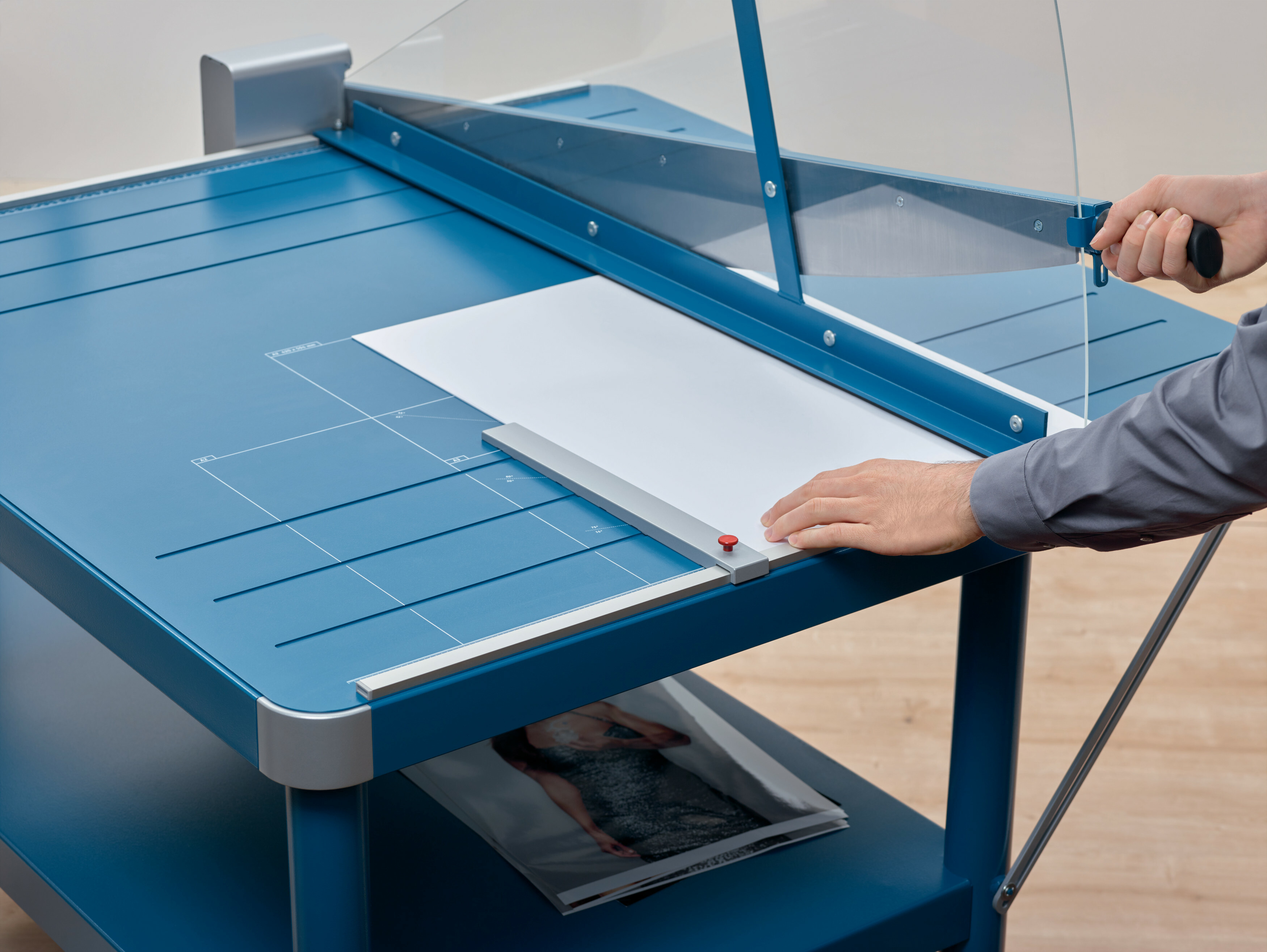 30 Sheet Cutting Capacity - 43" Cutting Length - 49" Height x 46" Length - Self-sharpening, Sturdy, Safety Guard, Protective Acrylic Shield, Manual Paper Clamp, Adjustable Alignment Guide, Screened Guide, Metal Base, Key Lock - Metal, Acrylic, Steel, Aluminum, Plastic, Rubber - Blue - 1 Carton