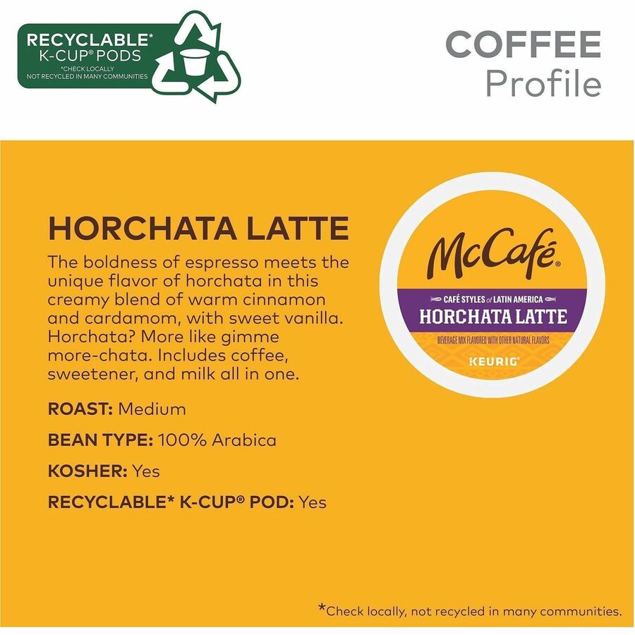 Experience the authentic taste of Latin America anywhere with McCafe Horchata Latte. Part of Cafe Styles of Latin America, this delicious beverage is inspired by the unique flavors and vibrant culture of the region. It delivers the boldness of espresso with the unique flavor of horchata in a creamy blend of warm cinnamon, cardamom and sweet vanilla in one easy step. This medium-roast coffee is exceptionally rich, wonderfully balanced and refreshingly full-flavored. Because the coffee, sweetener and milk are already blended, all you have to do is brew on the 8 oz. setting and enjoy. It is made from 100 percent Arabica coffee and 100 percent responsibly sourced. Caffeinated coffee comes in airtight, recyclable K-Cups for single-cup brewing systems. K-Cups are easy to use. Simply shake and insert into your Keurig coffee brewer for a delicious cup of coffee. |