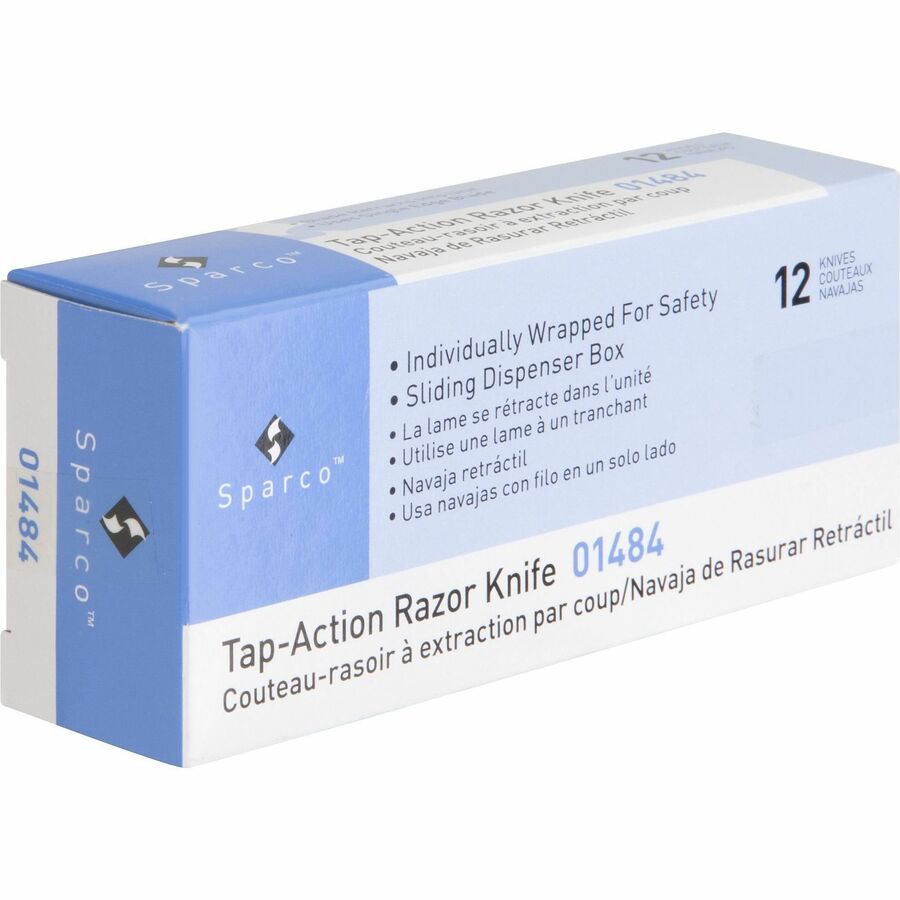 | Marketing Information | Tap Action Razor Knife uses retractable, reversible single-edge razor blades. Knife weighs 1 oz. Preset blade exposure prevents merchandise damage. Tap and blade appears. Tap again, and it disappears. |
