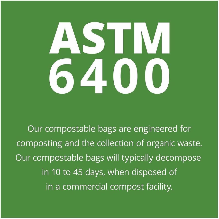 Compostable trash bags meet ASTM 6400 certifications for compostable plastics. The bags are 100 percent compostable. Bags control odor and dissipate moisture. |