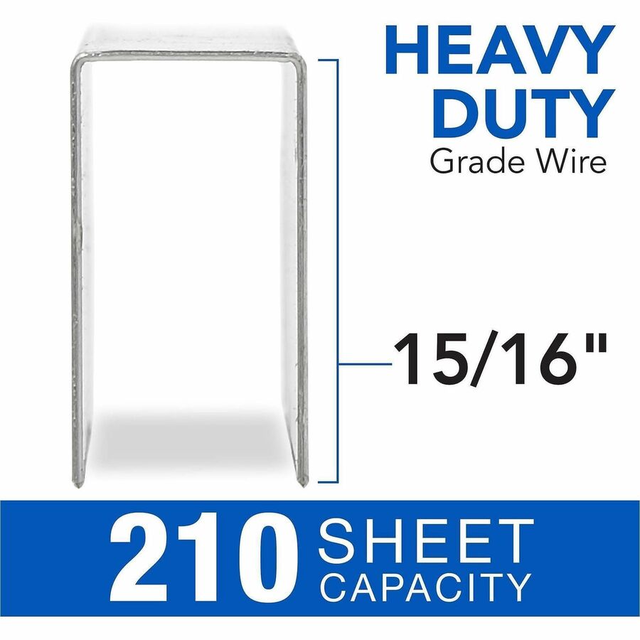 | Marketing Information | Premium Heavy-Duty Staples provide the most secure fastening solution for large stacks of paper. Sharp chisel point delivers better piercing ability and less jamming. Staple capacity is 210 sheets of 20 lb. paper. Leg length is 15/16". Use with heavy-duty staplers only. |